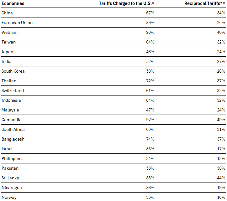 Note: *Tariffs charged to the U.S. include currency manipulation and trade barriers, and are according to the U.S. administration as published. **This graphic now reflects figures from the Annex of the executive order, correcting discrepancies found in earlier White House communication.